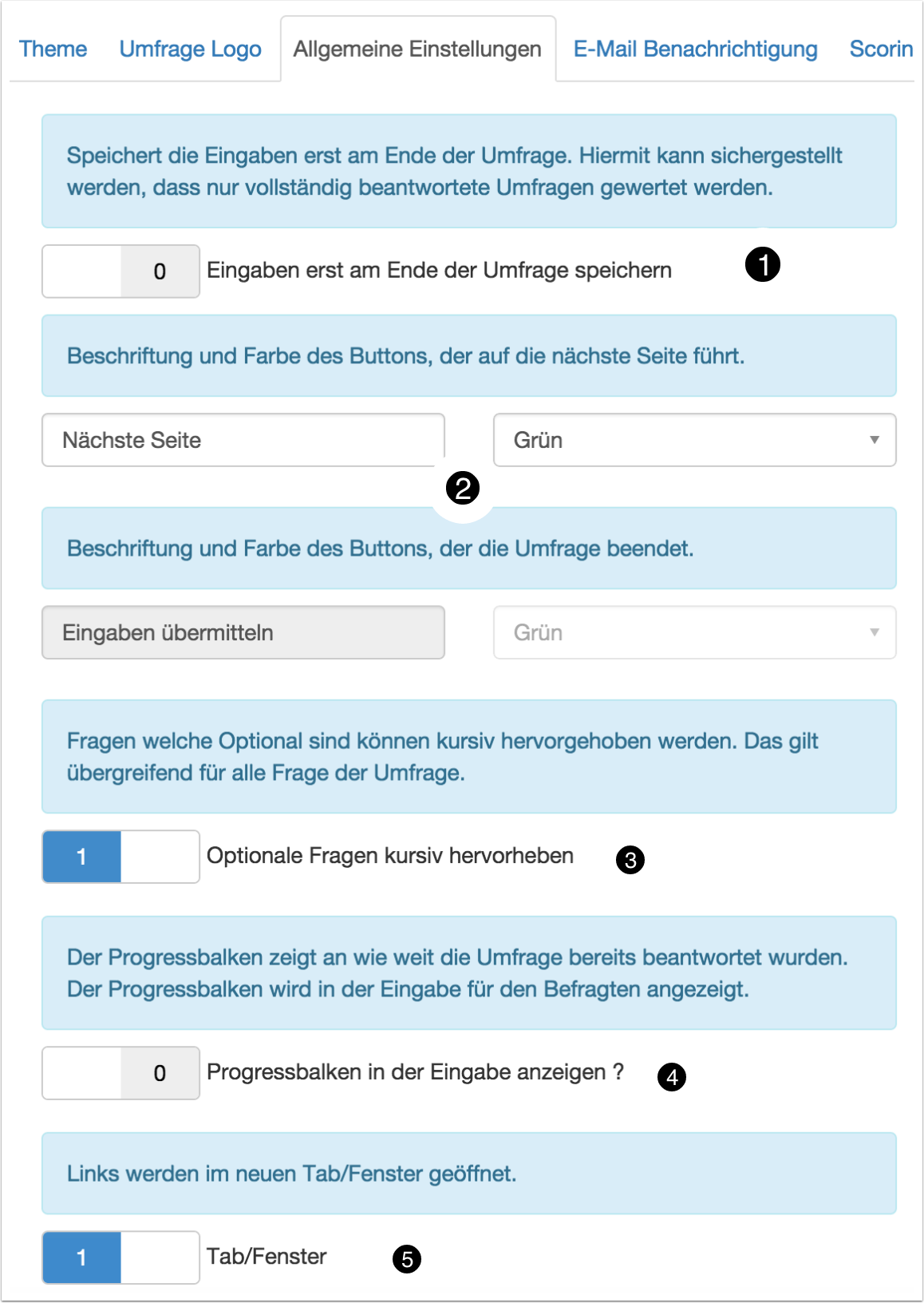 | 4 | Einstellungen | Hier werden allgemeine Umfrageeinstellungen wie Theme, Logo, E-Mailbenachrichtigung etc, eingestellt. |